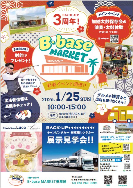 2026.01.15 B-base MARKET開催‼(BACK-UP3周年イベント) 2026年1月25日(日)10:00~15:00 BACK-UP3周年イベント開催いたします!豪華記念品をご用意して皆様のご来店をお待ちしております。どうぞよろしくお願いいたします。 < 前のページ 最新の投稿 2026.01.15 B-base MARKET開催‼(BACK-UP3周年イベント) 2025.10.29 Happy1Turboが仲間入り‼ 2025.10.15 アウルが仲間入り‼ 2025.08.19 B-baseMARKET開催決定!! 2025.07.22 江の島が仲間入り‼ カテゴリ お知らせ 月毎アーカイブ 2026年1月 2025年10月 2025年8月 2025年7月 2025年5月 2025年4月 2024年12月 2024年10月 2024年9月 2024年7月 2024年5月 2024年4月 2024年3月 2023年12月 2023年10月 2023年9月 2023年8月 2023年6月 2023年1月